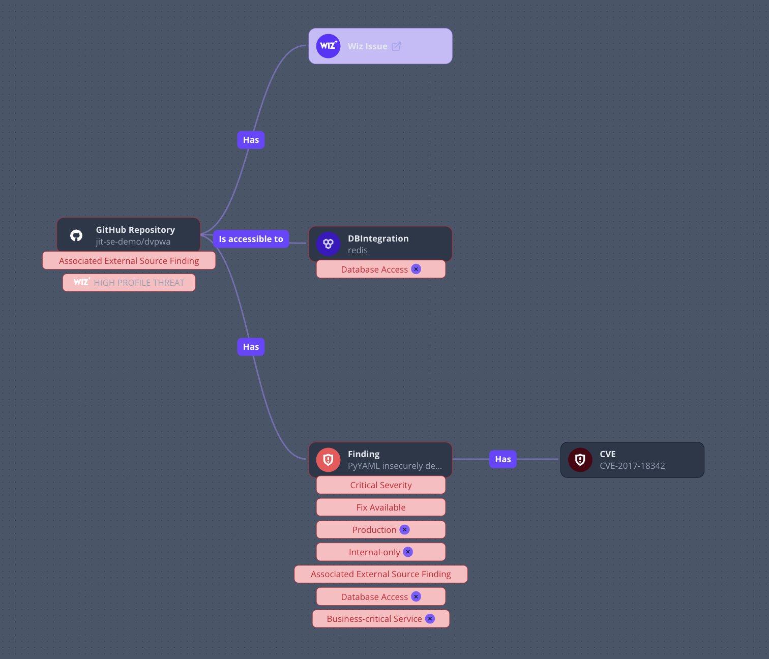 This visualization describes how the security finding is deployed. Labels are attached to the relevant resources to describe the prioritization factors, like whether the issue is deployed to production, calls a database, is exposed to the internet, and so on.
