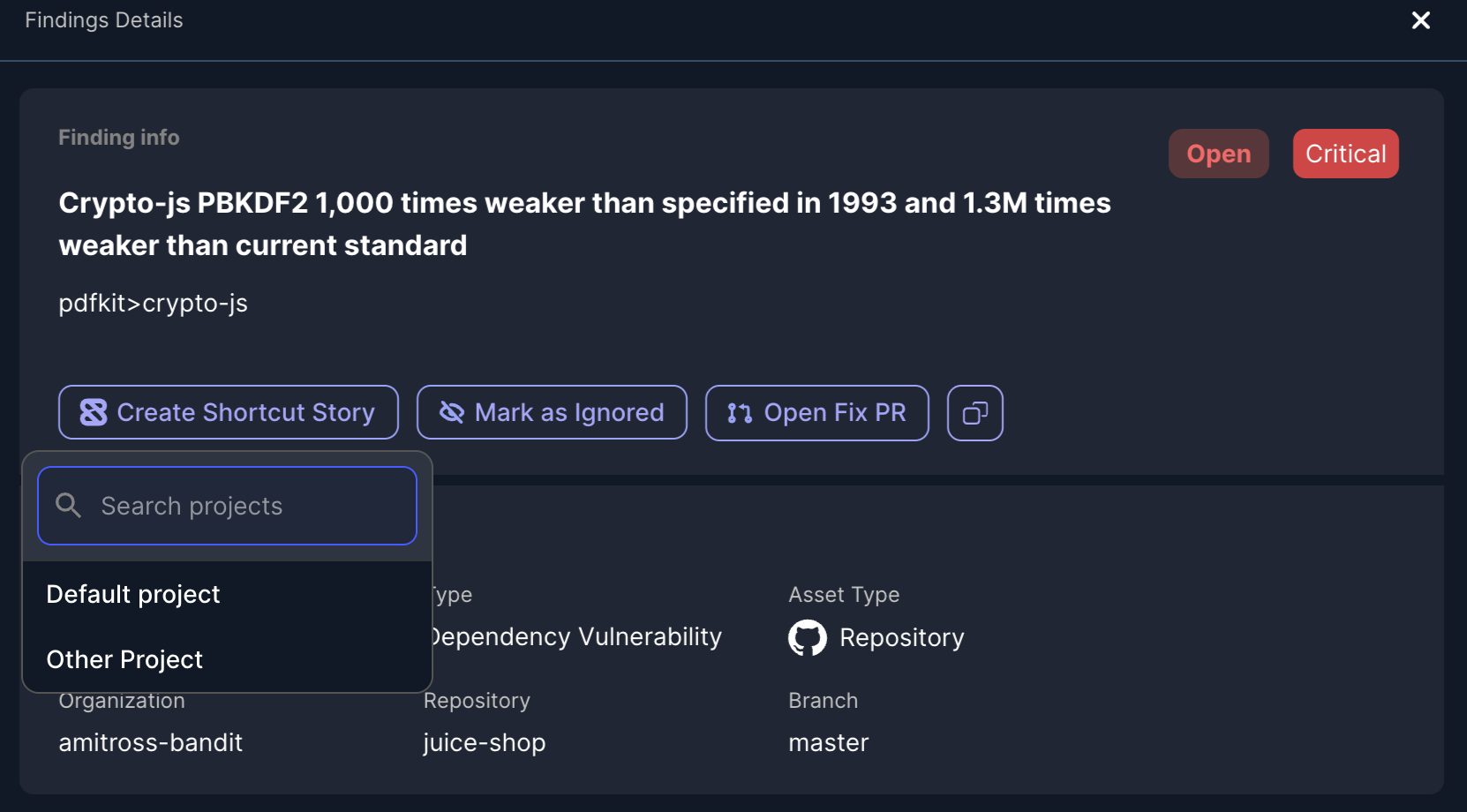 Integrating Shortcut with Jit allows you to create security-related stories directly from findings and track remediation progress. Stories are automatically created with the [Jit] prefix and the Opened-by-jit label for easy identification. Learn more here.