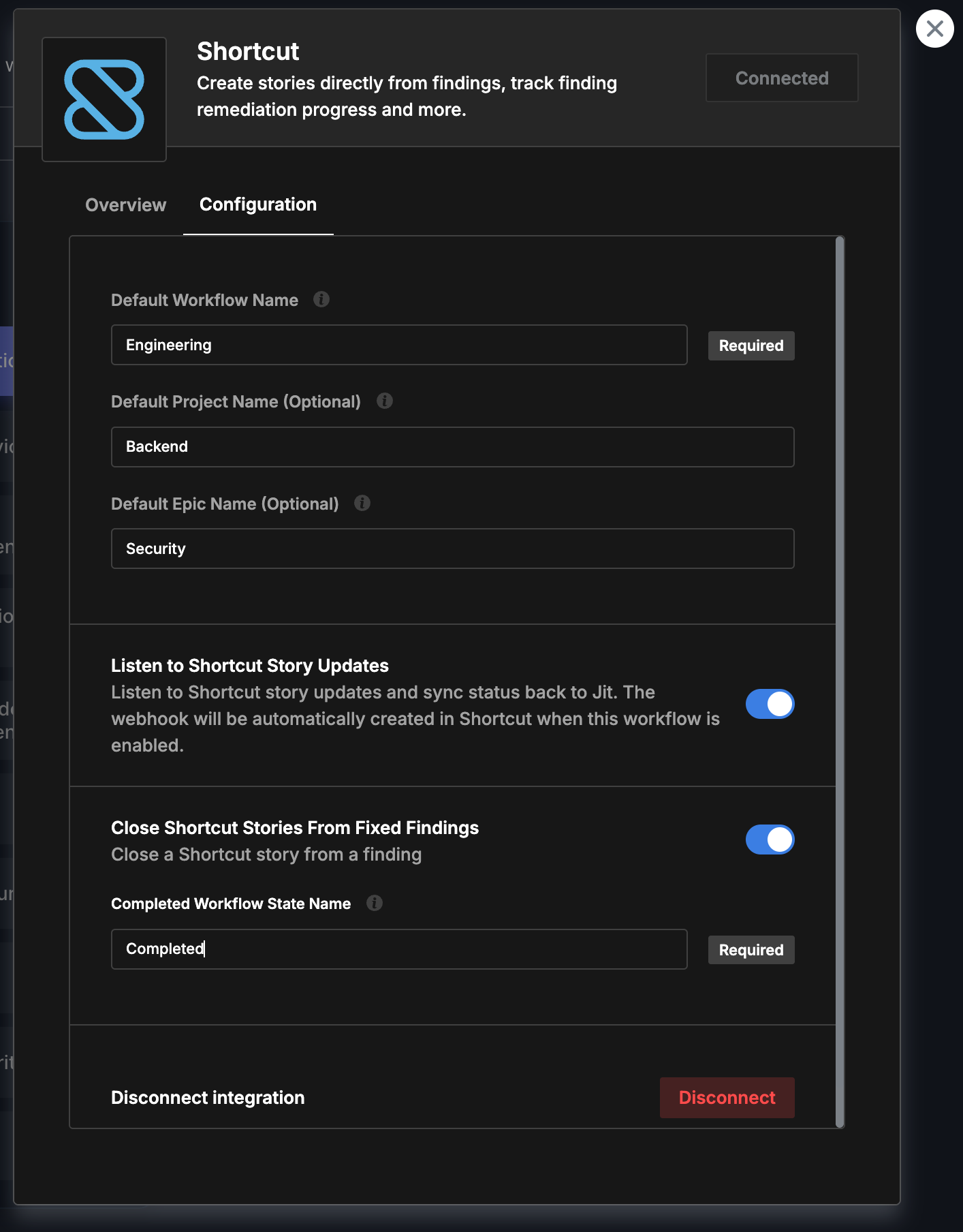 Automatic Webhook Creation: When you enable this workflow, Jit automatically creates a webhook in your Shortcut account. You don't need to manually configure webhooks - the integration handles this for you.