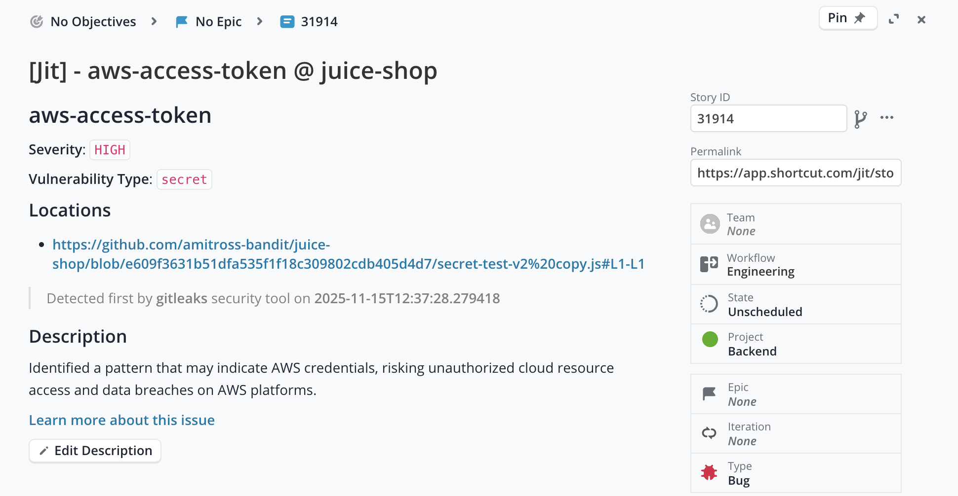 When a story is created from a finding, it will look like this: