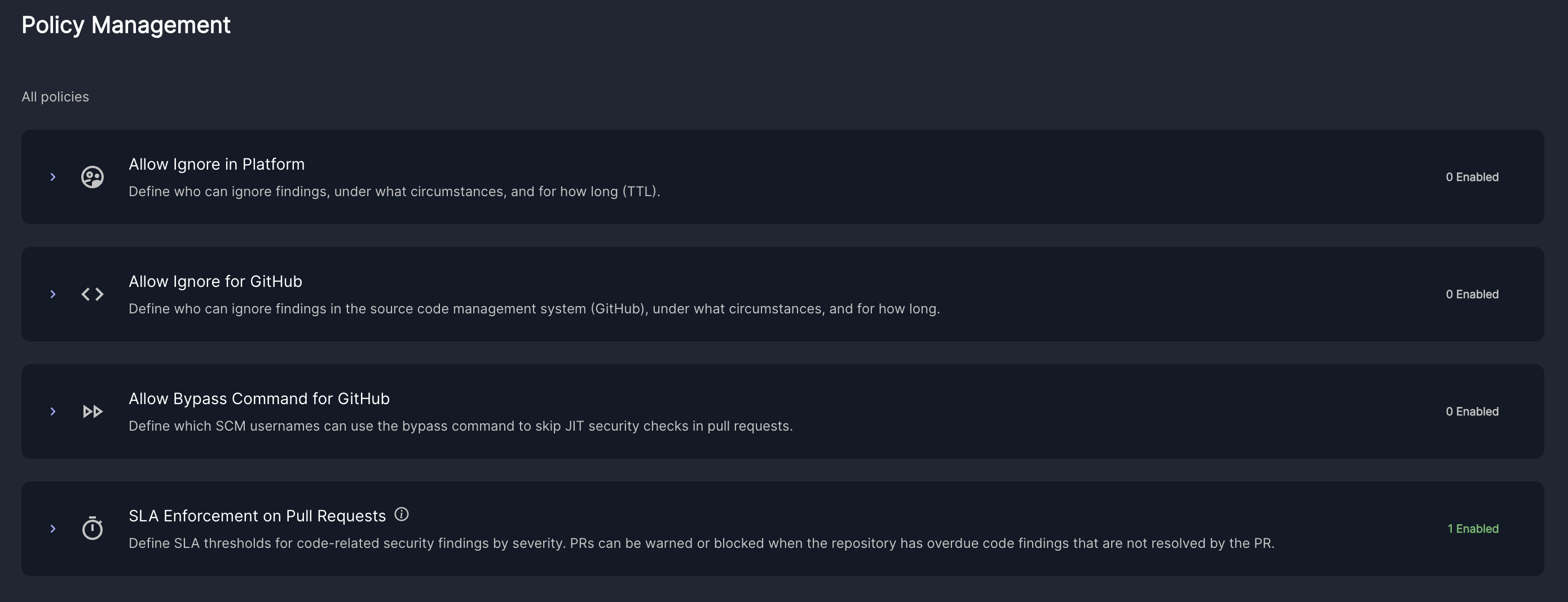 Policies let you define organization-wide security rules that apply consistently across repositories and SCMs.