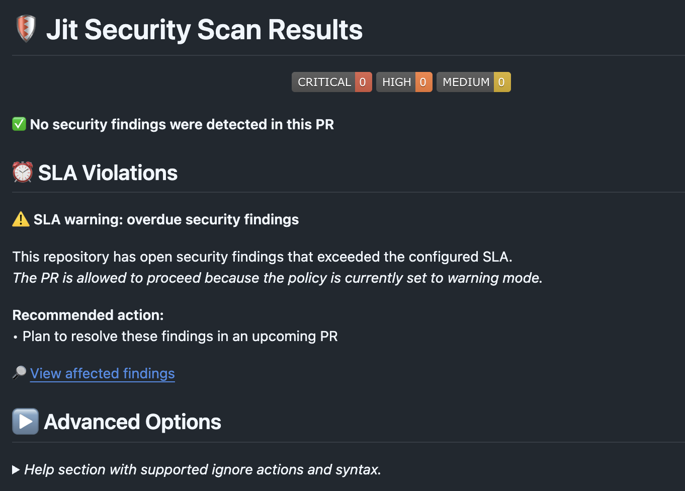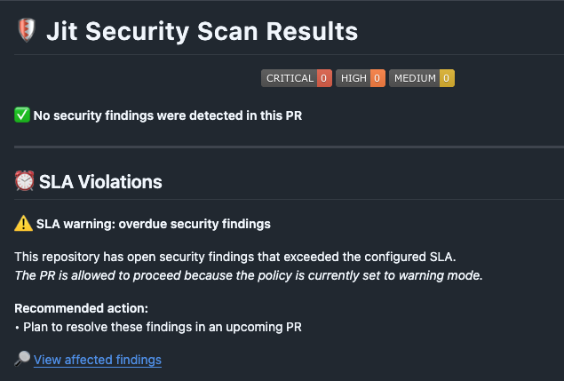 - Jit runs the standard PR scan (existing behavior for new findings in the PR).