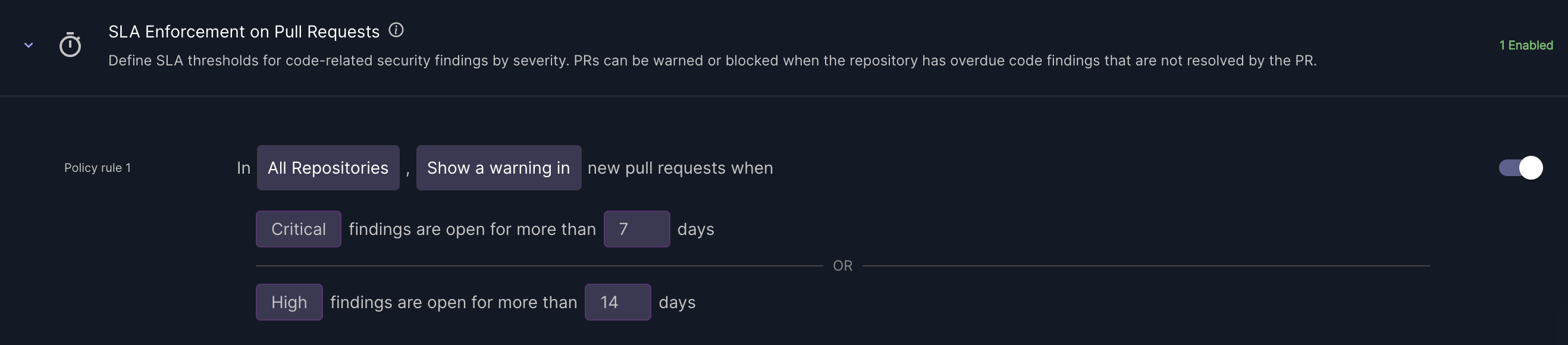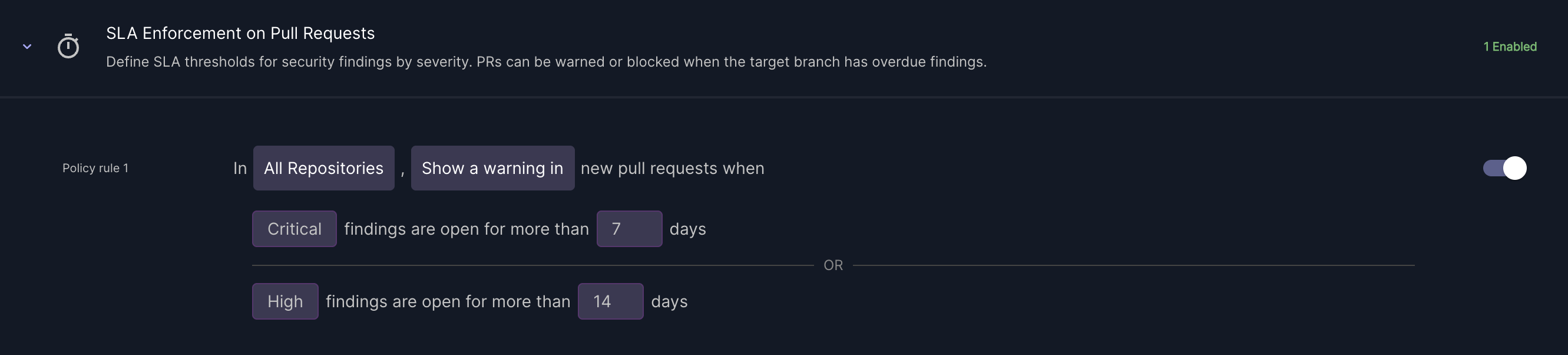 SLA Enforcement helps teams gradually enforce remediation SLAs for security findings without immediately blocking all development.