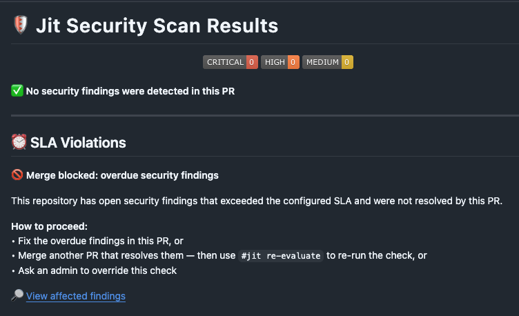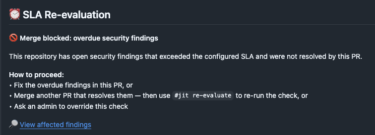 You can also trigger re-evaluation manually, without pushing a new commit, by commenting #jit re-evaluate on the PR. This is useful when another PR has already merged and resolved the overdue findings.